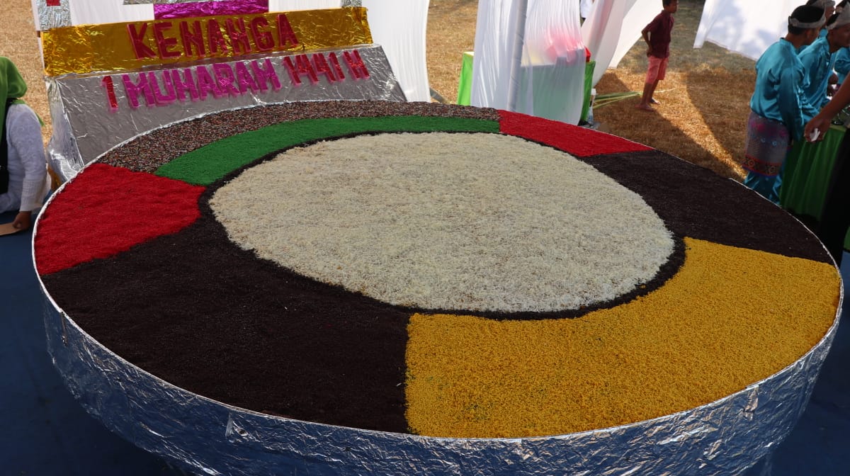 Sungailiat, bangka.go.id - Pada perayaan tahun baru Islam (Muharam) 1441 Hijriah/2019 Masehi, Minggu (01/09/19) di Lapangan Bola Kelurahan Kenanga, Kecamatan Sungailiat. Nampak Bolu Kujo raksasa yang memiliki diameter 2.65 meter dengan ketebalan 5 cm, berhasil membuat para pengunjung berdecak kagum. Bolu raksasa khas Daerah tersebut berhasil mendapatkan penghargaan dari Museum Rekor Dunia Indonesia (MURI).