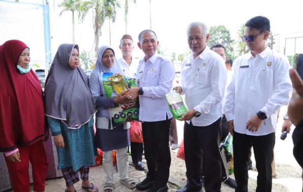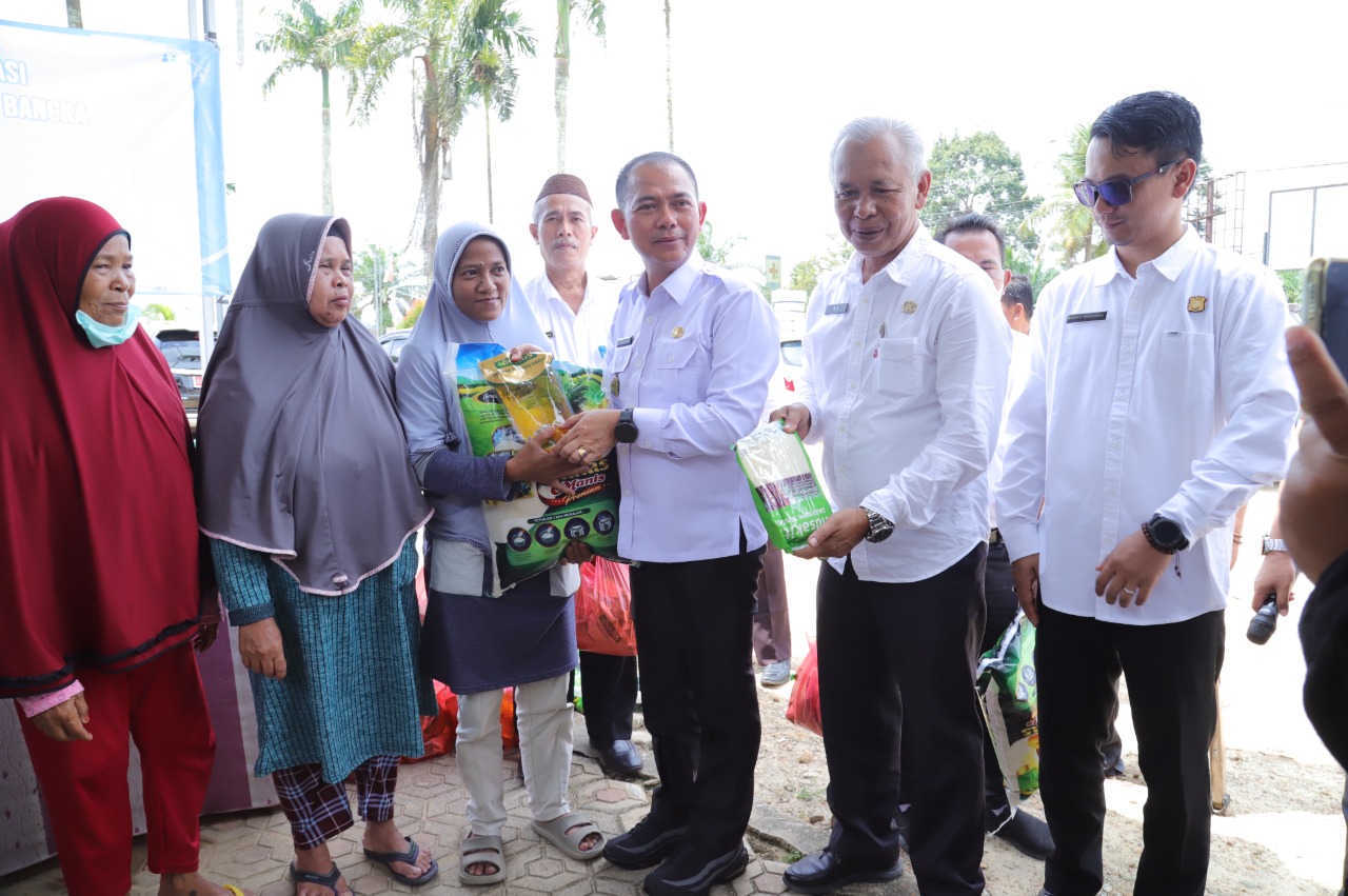 Mendo Barat - Bupati Bangka Mulkan SH., MH memberikan sembako secara simbolis kepada masyarakat desa petaling yang terdampak kenaikan BBM, bertempat di halam kantor camat mendo barat, Rabu (07/12/2022). Kegiatan ini merupakan salah satu langkah strategis yang ditempuh Pemerintah untuk menanggulangi dampak kenaikan harga BBM . Bantuan sosial ini diberikan sebanyak 2 kali berupa Beras sebanyak 20 Kilo Gram, Minyak goreng premiun 8 Liter dan gula pasir 8 kilo gram. Dalam sambutanya Bupati mengatakan dalam rangka pengendalian dan antisipasi dampak kenaikan harga BBM beberapa waktu yang lalu. "Pemerintah pusat maupun daerah melaksanakan berbagai kebijakan strategis agar dampak inflasi di daerah dapat diantisipasi untuk melindungi kelompok masyarakat rentan dan menjaga daya beli masyarakat," jelasnya "Bagaimana kita selaku pelayan masyarakat memberi suatu perhatian khusus kepada masyarakat kita yang betul-betul berhak mendapatkan bantuan ataupun uluran tangan dari kita semua,"pungkasnya