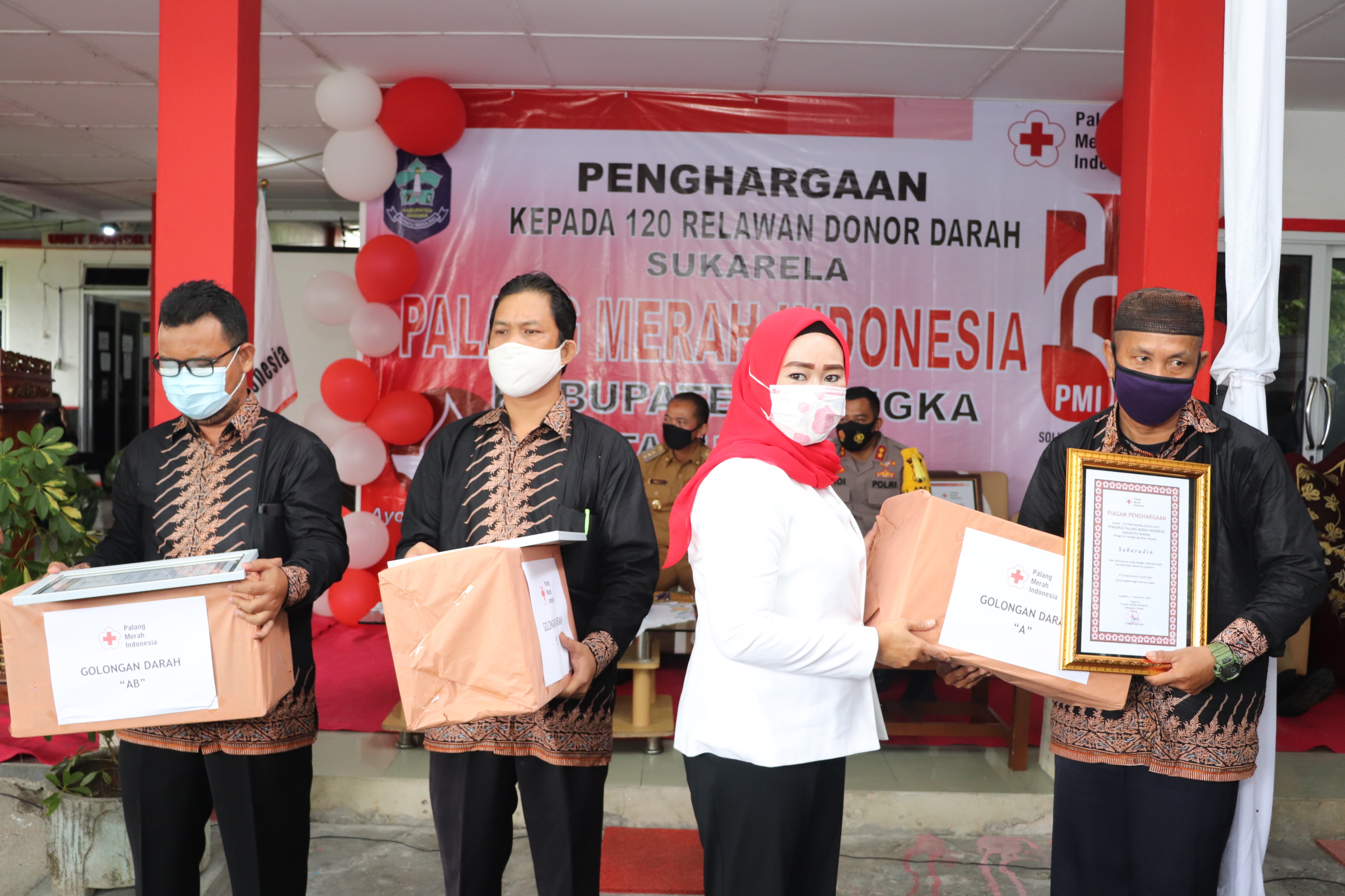 Sungailiat - Dalam rangka peringatan hari ulang tahun Palang Merah Indonesia (PMI) yang ke 75 tahun, PMI Kabupaten Bangka memberikan penghargaan bagi 120 orang pendonor aktiv serta pemotongan tumpeng di Halaman PMI Bangka, Senin (21/9/2020).