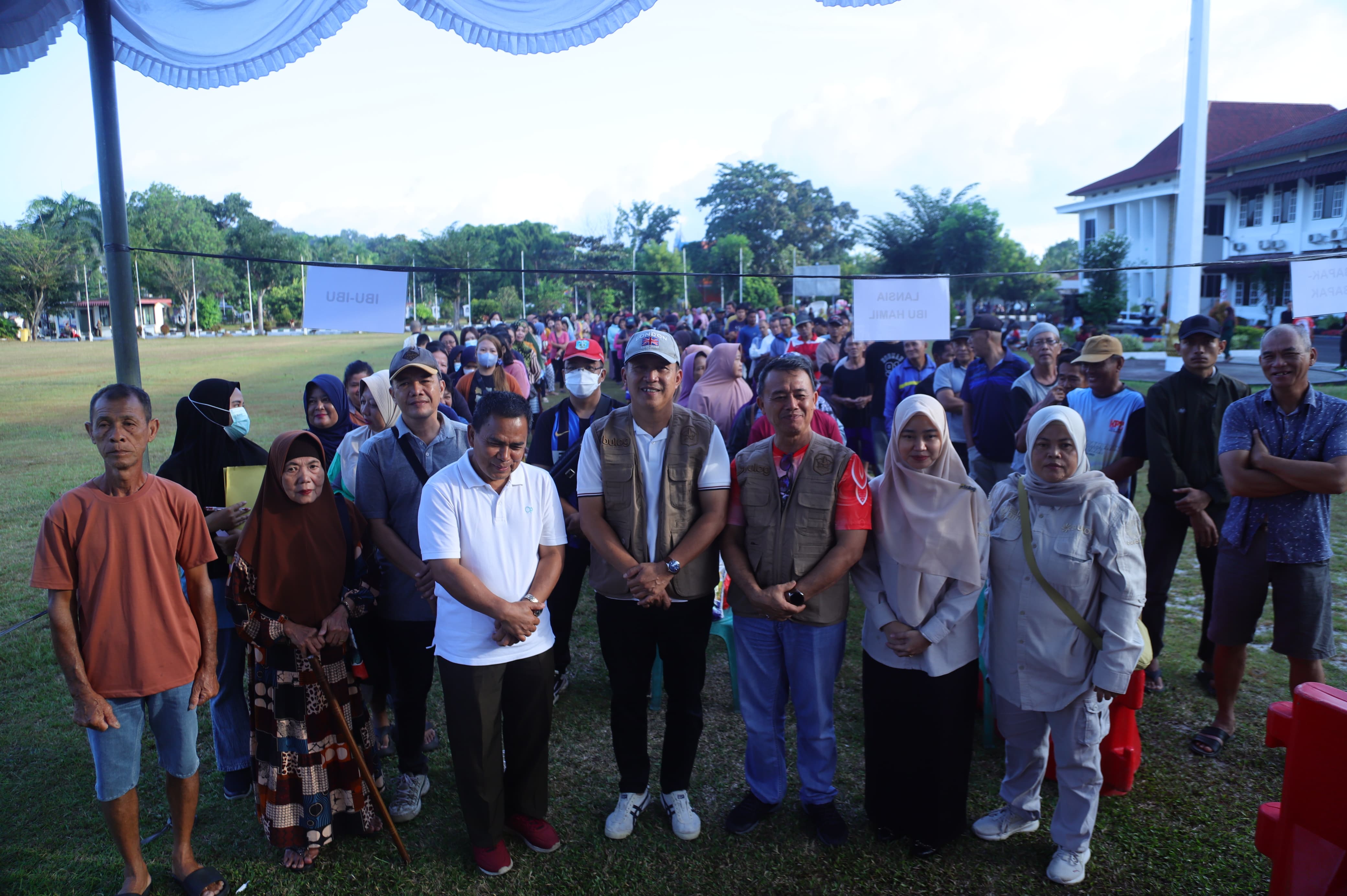 Sungailiat - Bupati Bangka H. Fery Insani dan Wakil Bupati Bangka, Syahbudin S.IP M.Tr.Ip meninjau langsung pelaksanaan operasi pasar murah yang digelar di Halam Kantor Bupati Bangka, Sabtu (14/02/2026).