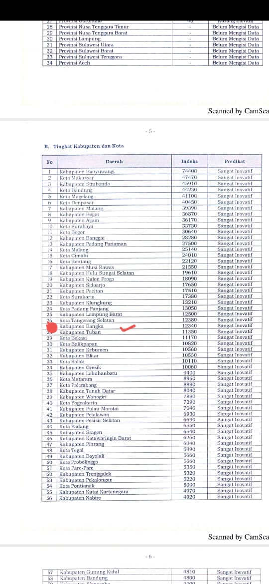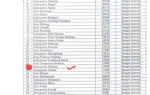 Bahkan, predikat sangat inovatif yang diraih kabupaten berjuluk Sepintu Sedulang tersebut menjadi salah satu dari kabupaten/kota se-provinsi Kepulauan Bangka Belitung.