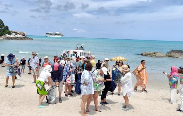 Kapal pesiar mewah Paul Gauguin Cruise, singgah di perairan Bangka, mengangkut kurang lebih200 wisatawan mancanegara yang datang untuk menikmati keindahan alam dan budaya lokal yang memukau.