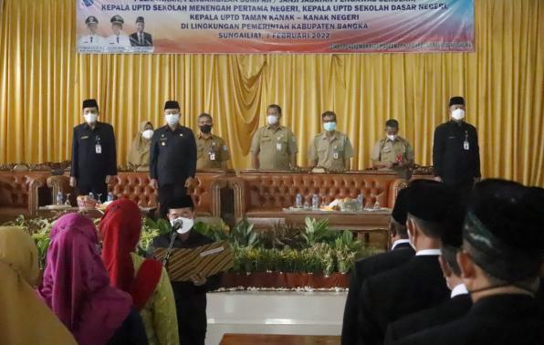 Sungailiat - Bupati Bangka, Mulkan SH MH., melantik 6 Pengawas Sekolah, 15 Kepala Sekolah Menengah Pertama (SMP) Negeri, 49 Kepala Sekolah Dasar (SD) Negeri dan 1 Kepala Taman Kanak-Kanak (TK) Negeri di lingkungan Pemerintah Daerah (Pemda) Kabupaten Bangka. Usai melantik Bupati berharap para Pengawas dan Kepala Sekolah dapat meningkatkan mutu dunia pendidikan di Kabupaten Bangka. "Tugas kita bersama untuk meningkatkan mutu dan kualitas dunia pendidikan kita," imbuh Mulkan dalam kata sambutannya usai melantik serta mengambil sumpah dan janji jabatan yang berlangsung di Gedung Sepintu Sedulang, Senin (07/02/22). Disampaikan Mulkan, menjadi Kepala Sekolah merupakan amanah yang harus diemban serius. Menurutnya majunya dunia pendidikan juga tidak terlepas dari peran serta Kepala Sekolah yang memiliki integritas. "Pelantikan ini salah satu pengembangan karir untuk aset kita di lingkungan Pemkab Bangka secara terkhusus. Maju tidaknya sekolah ada di tanggujawab Kepala Sekolah dalam mengatur para guru," tuturnya. Ditambahkannya, hal ini akan menjadu fokus Pemerintah Daerah dalam mewujudkan dunia pendidikan bermutu lewat generasi penerus yang berkualitas. "Jadi Kepala Sekolah tidak gampang, ini akan menjadi penilaian Kepala Daerah seperti apa kedisiplinan nanti di lapangan. Pengawas dan Kepala Sekolah adalah abdi masyarakat dan merupakan pelayanan yang harus memberikan pelayanannya di dunia pendidikan, pungkas Mulkan. Turut hadir dalam acara tersebut Wakil Bupati (Wabup) Bangka, Syahbudin, SIP., Sekretaris Daerah (Sekda) Bangka beserta segenap Kepala Organisasi Perangkat Daerah (OPD) Pemkab Bangka.