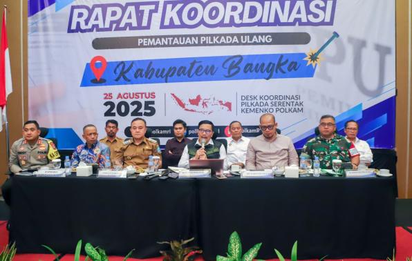 Pangkalpinang - Kementerian Koordinator Bidang Politik dan Keamanan Republik Indonesia (Kemenko Polkam RI) menyelenggarakan Rapat Koordinasi Kesiapan dan Pemantauan terkait Pilkada Ulang Kabupaten Bangka yang di selenggarakan di Ballroom Hotel Sol Marina Pangkalpinang, Senin (25/08/2025).