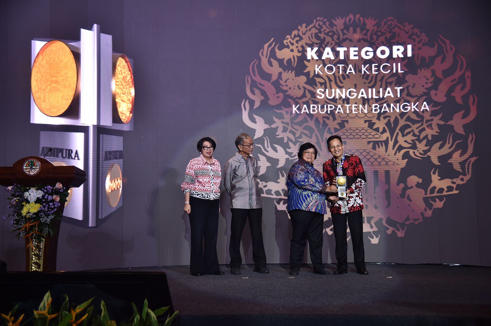 Piala Adipura ini diserahkan langsung oleh Menteri Lingkungan Hidup dan Kehutanan Republik Indonesia Siti Nurbaya di Auditorium Dr. Soejarwo kepada Bupati Bangka yang di wakili oleh Sekretaris Daerah Kabupaten Bangka Drs. Andi Hudirman, di Gedung Manggala Wanabakti, Jakarta Pusat, Selasa (28/02/2023).