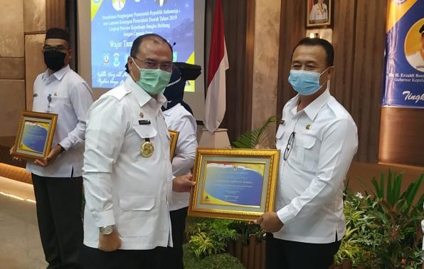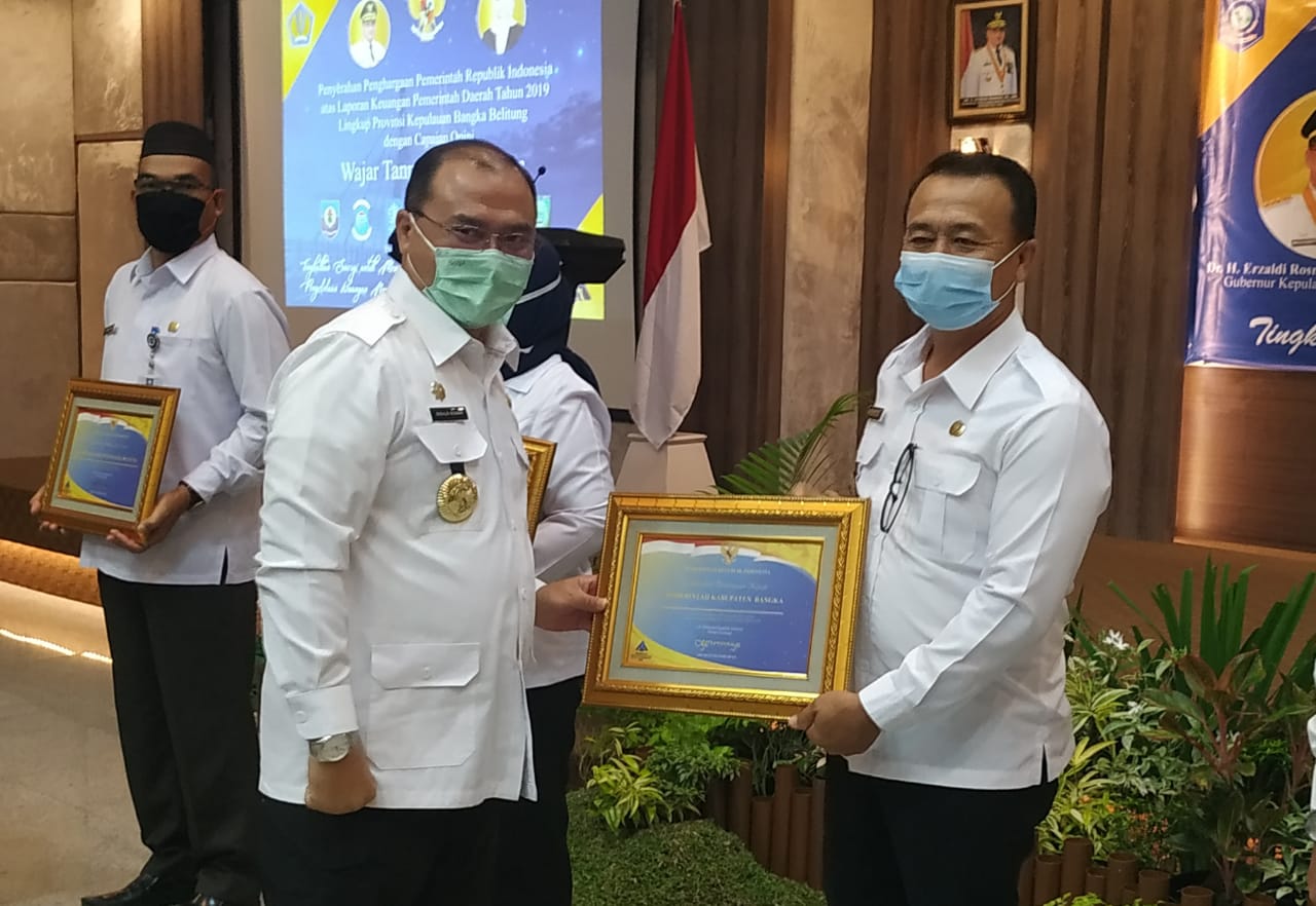 Pangkalpinang – Capaian Opini Wajar Tanpa Pengecualian (WTP) atas Laporan Keuangan Pemerintah Daerah Tahun 2019 yang diraih Pemkab Bangka mendapat Penghargaan dari Pemerintah Republik Indonesia melalui Kementerian Keuangan RI. Penghargan tersebut diserahkan oleh Gubernur Kepulauan Bangka Belitung Erzaldi Rosman Johan kepada Wakil Bupati Bangka Syahbudin, SIP, dalam sebuah acara yang digelar oleh Kanwil Perbendaharaan Bangka Belitung, Rabu (13/10/2020) di Ruang Pertemuan Pasir Padi, Kantor Gubernur Babel.