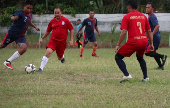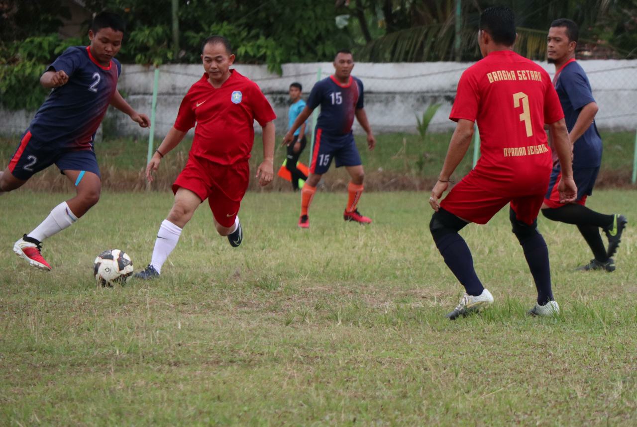 SUNGAILIAT - Laga persahabatan yang digelar antara kesebelasan PS Bangka Setara (Pemkab Bangka) melawan PS Wartawan Bangka berlangsung sengit. Jual beli tendangan nampak di lapangan hijau Orom Sungailiat, Sabtu sore (15/08/2020). Ujung laga tersebut berhasil dimenangkan oleh PS Bangka Setara yang diperkuat oleh Bupati Bangka dengan skor akhir 4-2 atas PS Wartawan.