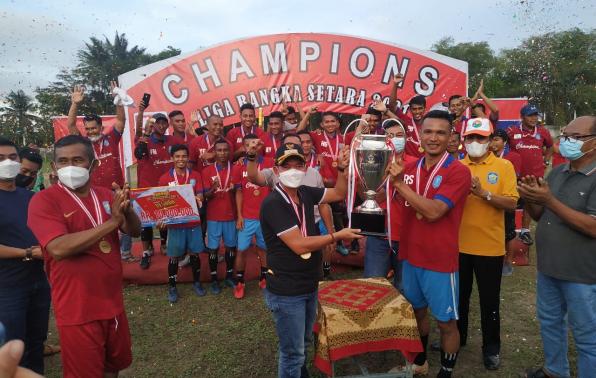 Sungailiat - Kesebelasan Pemkab FC berhasil menjuarai Liga Bangka Setara 2021, setelah dalam pertandingan final berhasil menghentikan langkah Kesebelasan Kecamatan Riau Silip dengan skor 5 - 3 (1-1), Minggu (28/3/21) di Stadion OROM Sungailiat.