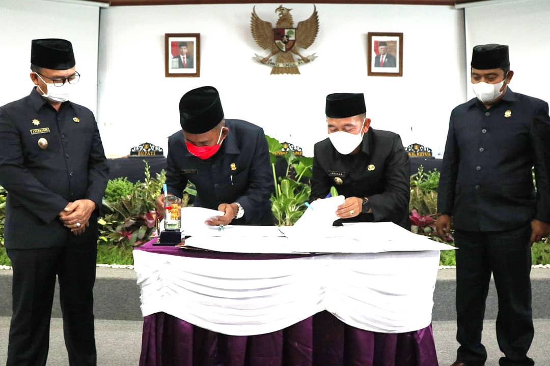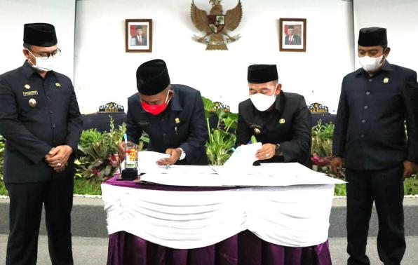 Sungailiat - Rancangan Perubahan APBD tahun anggaran 2021 telah disahkan. Prosesi pengesahan ditandai dengan penandatanganan sejumlah berkas oleh Bupati Bangka, Ketua DPRD beserta jajarannya disaksikan segenap tamu undangan yang hadir, Senin (20/09/2021) di Ruang Rapat Paripurna DPRD Kabupaten Bangka.