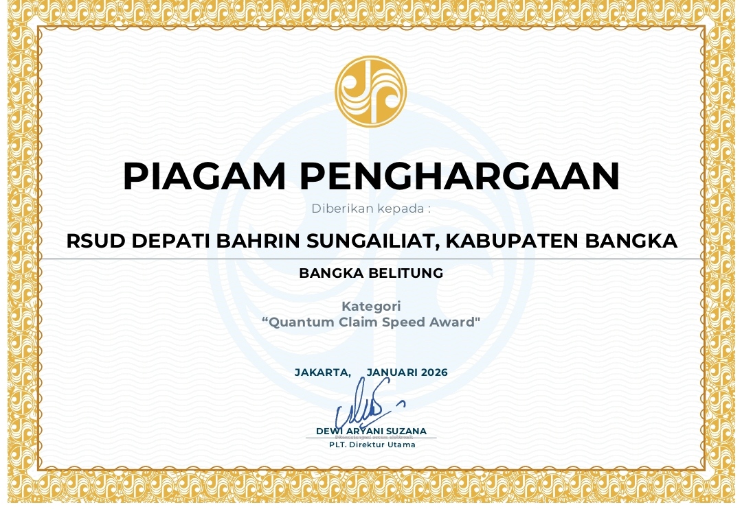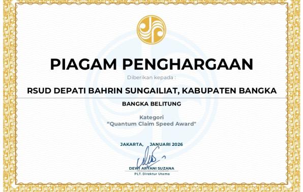 Sungailiat - RSUD Depati Bahrin kembali menorehkan prestasi membanggakan dengan menerima penghargaan “Quantum Claim Speed Award” dari PT Jasa Raharja, Kamis (12/02/2026).