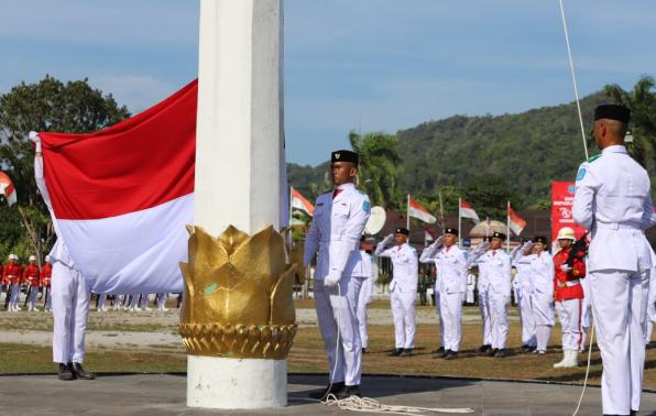 Sungailiat - Detik-detik penaikan Bendera Merah Putih di Kabupaten Bangka yang dilangsungkan pada 17 Agustus 2024 di Halaman Kantor Bupati Bangka berlangsung khidmat.