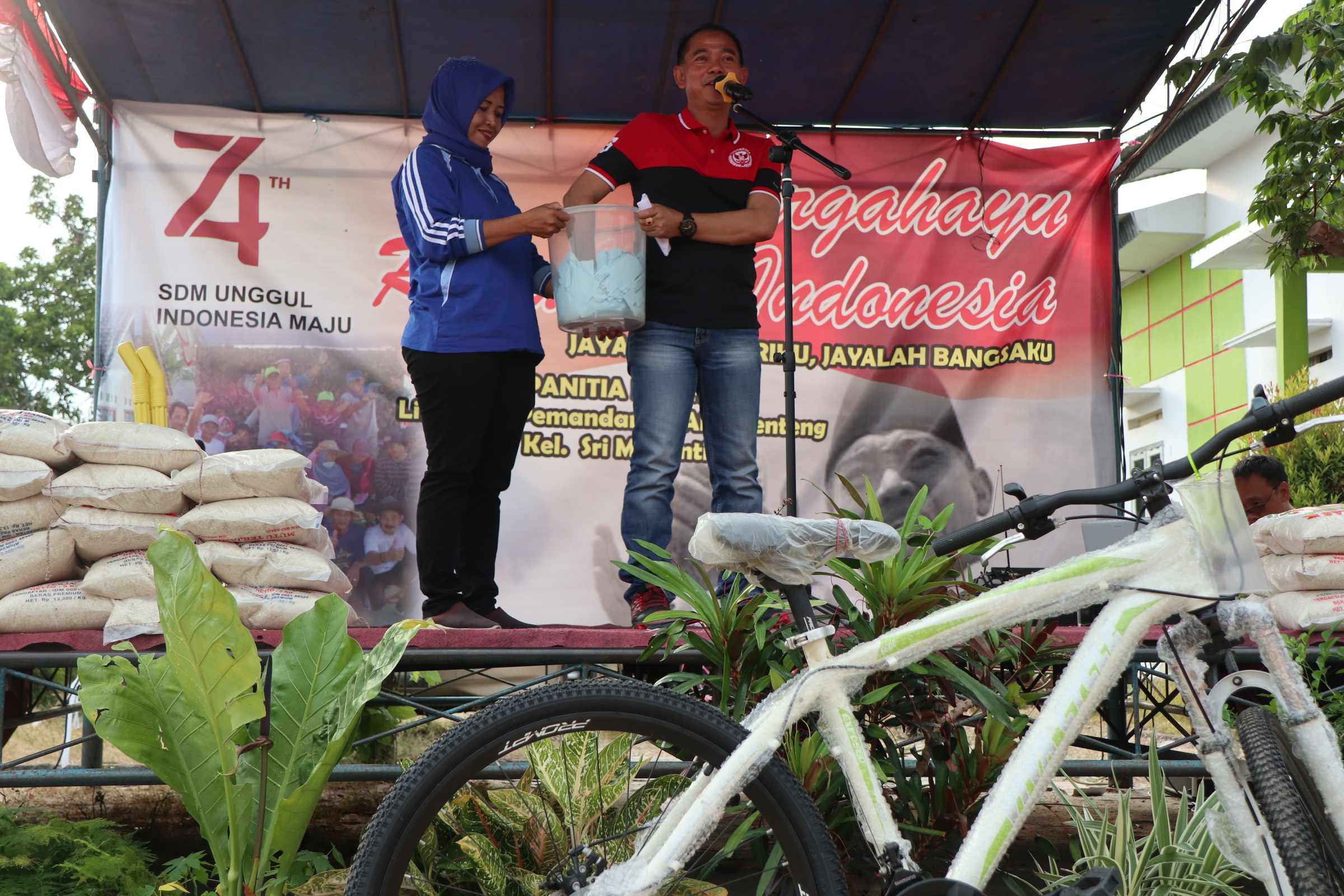Sungailiat, bangka.go.id - Masih dalam rangka menyemarakan Hari Ulang Tahun Republik Indonesia (HUT RI) ke 74 Tahun, Kelurahan Sri Menanti Sungailiat menggelar kegiatan jalan sehat yang diikuti warga sekitar. Bupati Bangka, Mulkan yang berkesempatan membuka kegiatan tersebut juga turut memeriahkan kegiatan dengan memberikan 20 karung beras dan 1 unit sepeda sebagai hadiah utama.