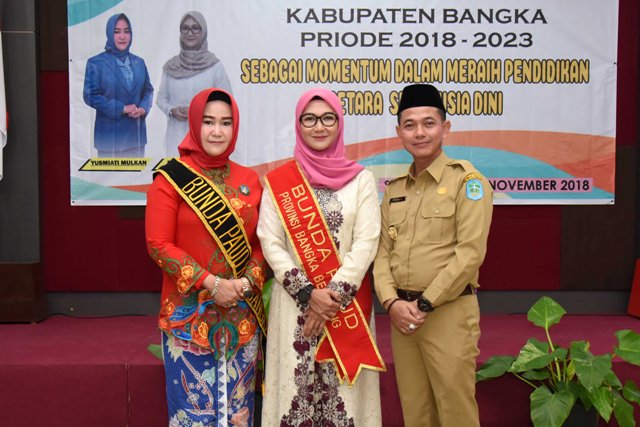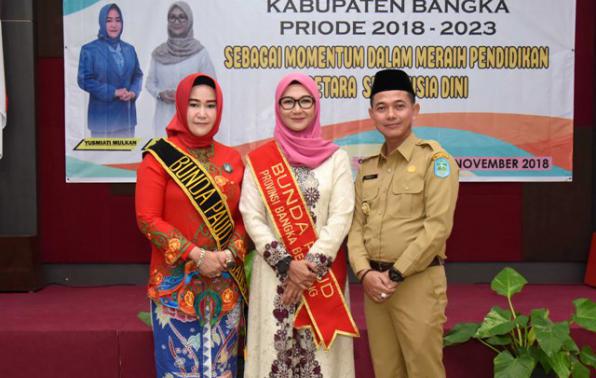 SUNGAILIAT—Yusmiati Mulkan secara resmi dikukuhkan menjadi menjadi Bunda PAUD (pendidikan anak usia dini) Kabupaten Bangka untuk masa periode 2018-2023. Pengukuhan ini dilakukan langsung oleh Bunda PAUD Provinsi Bangka Belitung, Melati Erzali, dan dihadiri oleh Bupati Bangka, Mulkan, SH. MH.